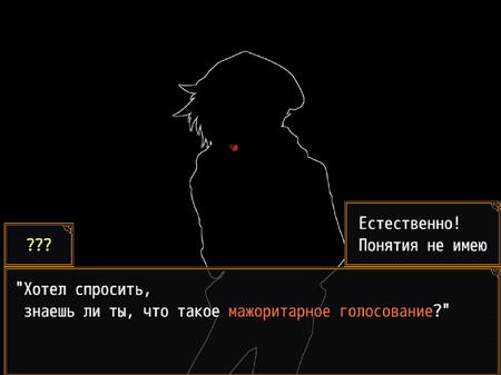Частично это перевод заметок vgperson, частично мои личные заметки. Статья содержит спойлеры к определённым частям игры, настоятельно рекомендуется читать после прохождения. Содержимое будет дополняться по мере продвижения перевода.Тэглайн игры «Смертельная Игра Решением Большинства» прошёл большой путь, перед тем как прийти к своему итоговому варианту. «Tasuuketsu Desu Gemu» — оригинальный тэглайн, который можно перевести «Решение Большинства Смертельная Игра». Выбранный вариант звучал наиболее похоже и адекватно.«Majority vote» переводится как «мажоритарное голосование» только один раз в интродакшне. Далее персонажи называют его просто «голосование», так как в русском языке голосование автоматически подразумевает под собой «решение большинства». В начале это невозможно, потому что нужно было сделать акцент, к тому же «ты знаешь, что такое голосование?» звучит очень глупо. Формулировка «ты знаешь, что такое голосование решением большинства?» тоже была откинута, так как нет смысла задавать вопрос о термине, который говорит сам за себя. Было использовано более «научное» словосочетание — «мажоритарное голосование», ведь его действительно можно не знать, и вопрос имеет смысл.